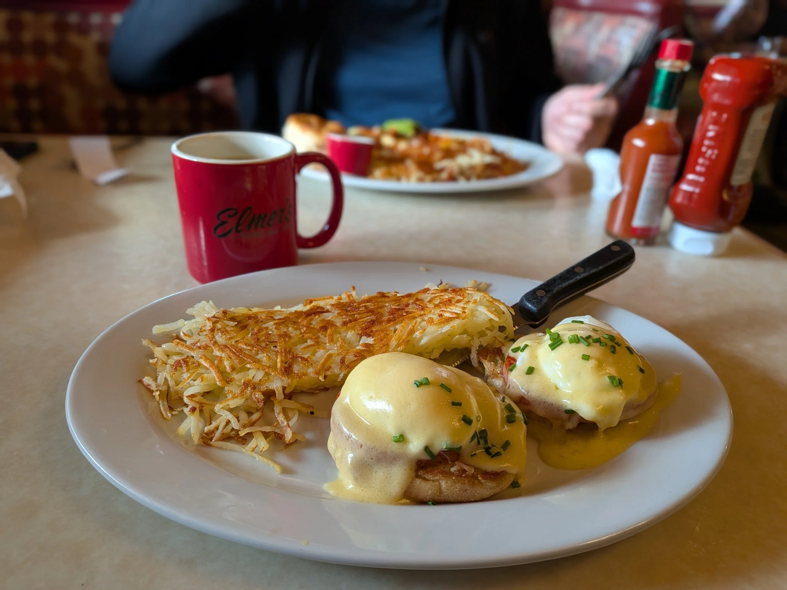 Zaczęliśmy od śniadania. W Vegas niby było dobre jedzonko ale jakoś tak zawsze w biegu. Tym razem też się trochę śpieszymy ale nie aż tak żeby nie zawitać do tradycyjnego amerykańskiego dineru na jajka i kawę bez limitu. W takim słoneczku, spodniach na góry, bluzie dresowej i w otoczeniu palm odrazu wszystko lepiej smakuje. Choć zdradzę wam, że się okazało, że Darek nie lubi palm….kaktusy jak najbardziej ale palmy średnio. Nawet po 15 latach małżeństwa można się coś o sobie nauczyć.