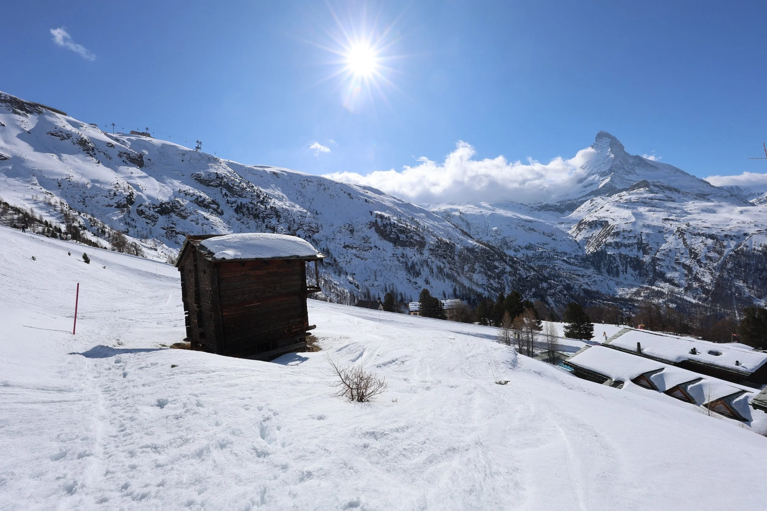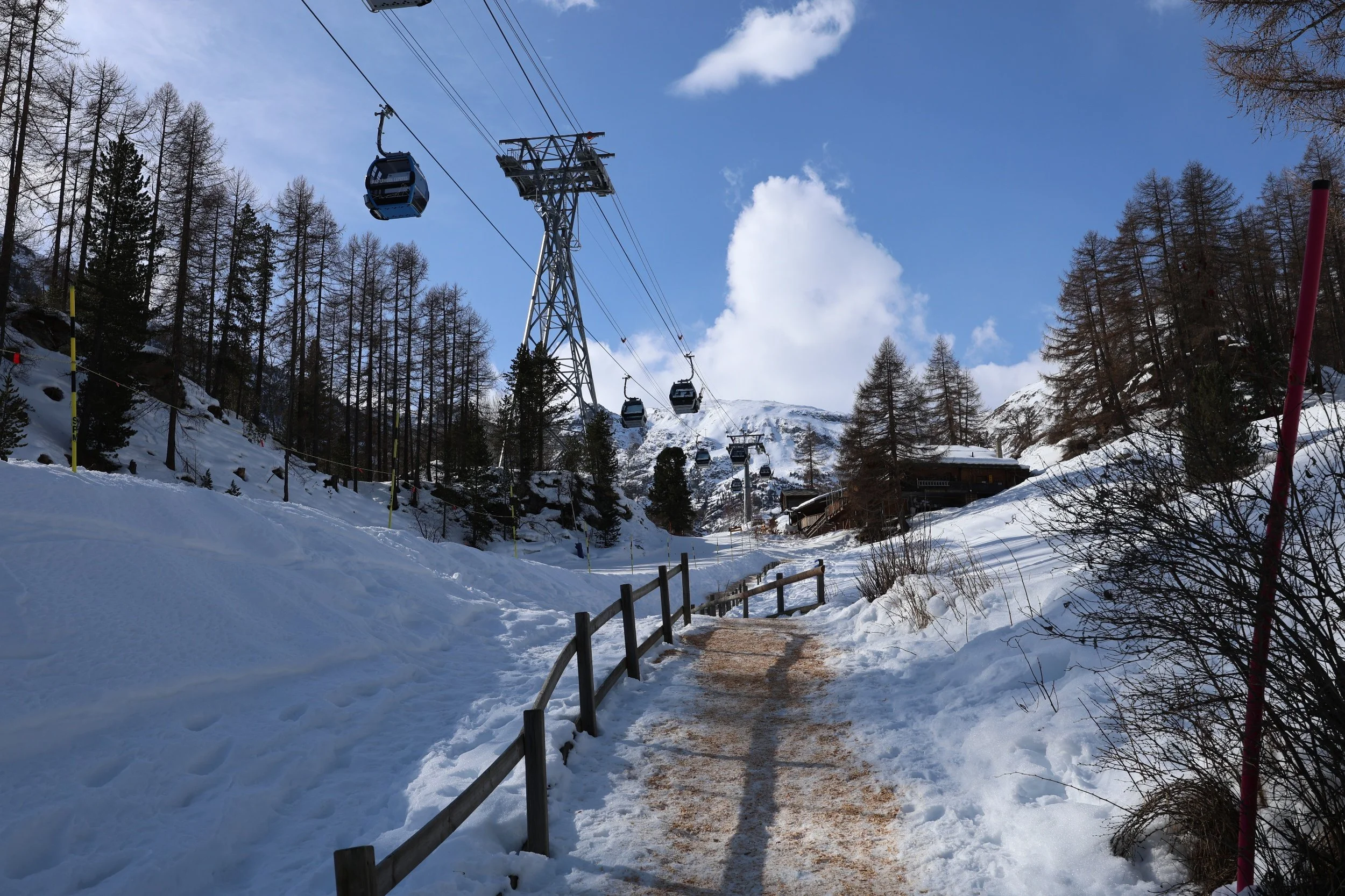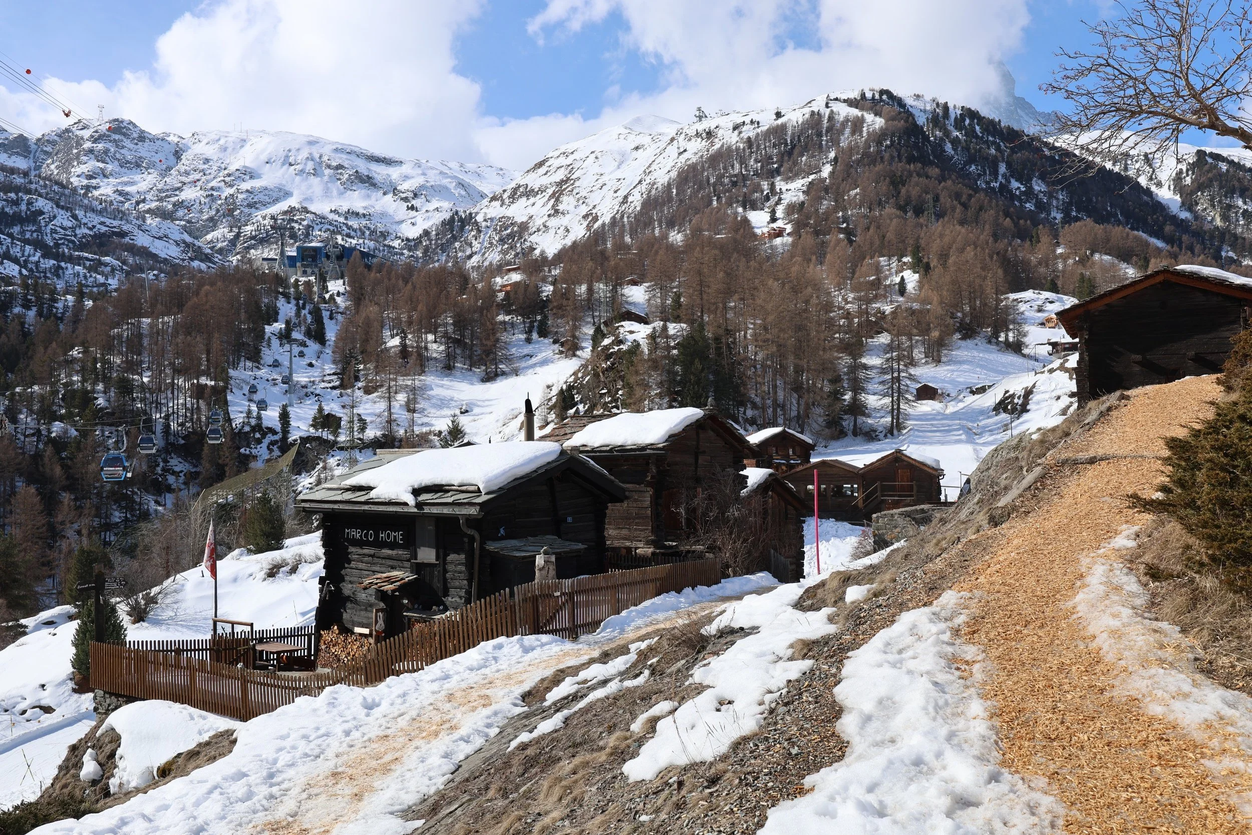 Na nogach ciężko wyjść na samą górę, zwłaszcza zimą więc ja cieszyłam się pięknym słoneczkiem i ruszyłam do Riffelalp. W Zermat jest dużo szlaków dlatego, że to jest miejsce gdzie jeździsz na nartach w najpiękniejszej części Alp i szlaki muszą się przeplatać z tarasami narciarskimi bo w lecie (i zimie) chodzi się po szlakach a nie trasach narciarskich. Do tego orzechodzi się przez miasteczka. Ciężko w sumie to miasteczkiem nazwać bo zazwyczaj są to 3-4 domy na krzyż i w każdym restauracja, ale nazwę ma, szlak też jest więc kto by się czepiał drobiazgów.