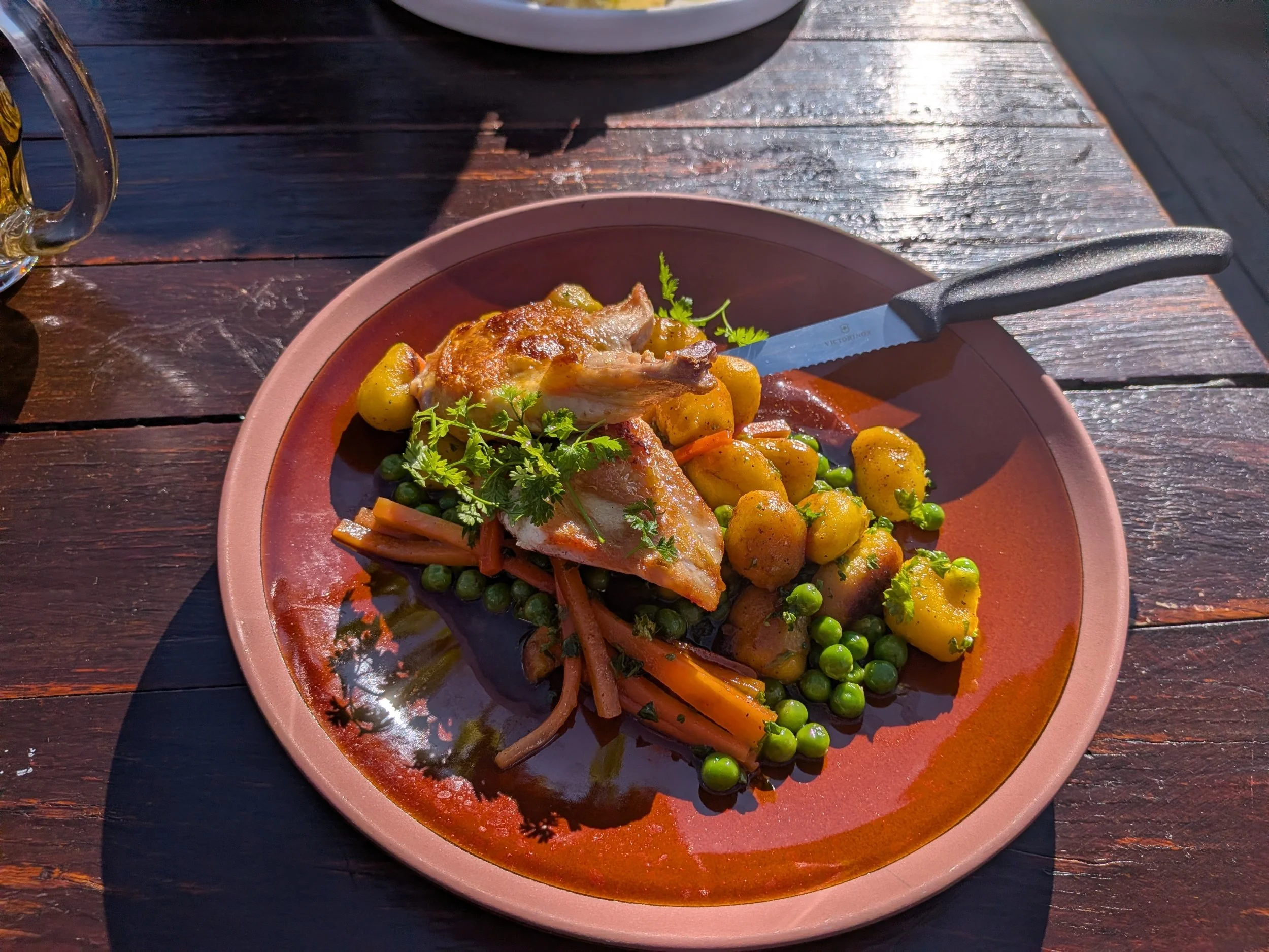 W Zermatt ciężko jest nie widzieć Matterhorn’a. Góruje nad miastem i wszędzie na szlaku go widać. Ale chyba najlepszy widok jest z Riffelalp i restauracji które tam pootwierali. Nasza ulubiona to Chami-Hitta. Byliśmy tam sześć lat temu i było pysznie. Teraz rozbudowali ją trochę i może nie ma już takiego fajnego starego klimatu ale nadal ma super widok i miłą obsługę. Zrobiliśmy sobie więc tam przerwę na nawodnienie.