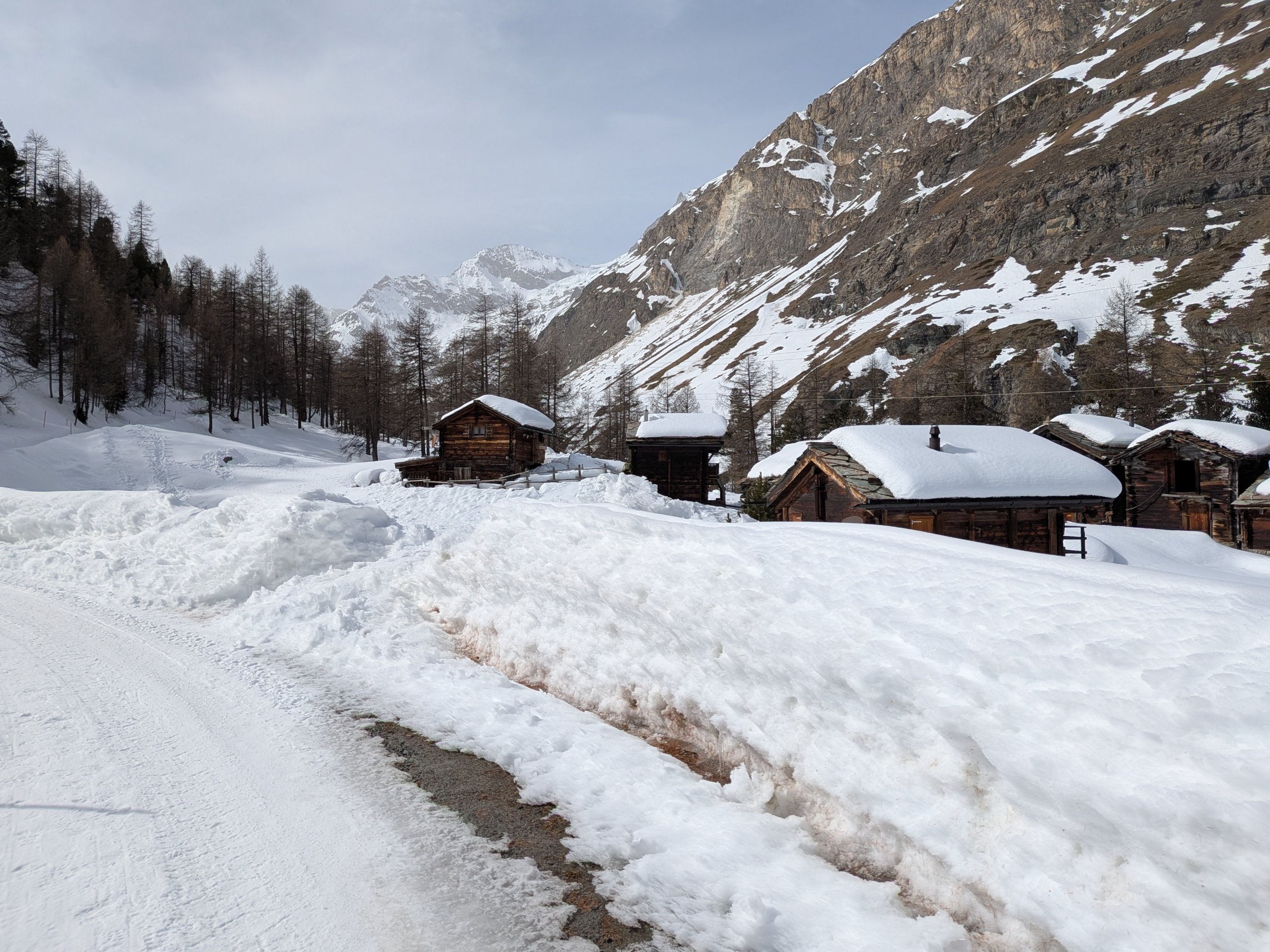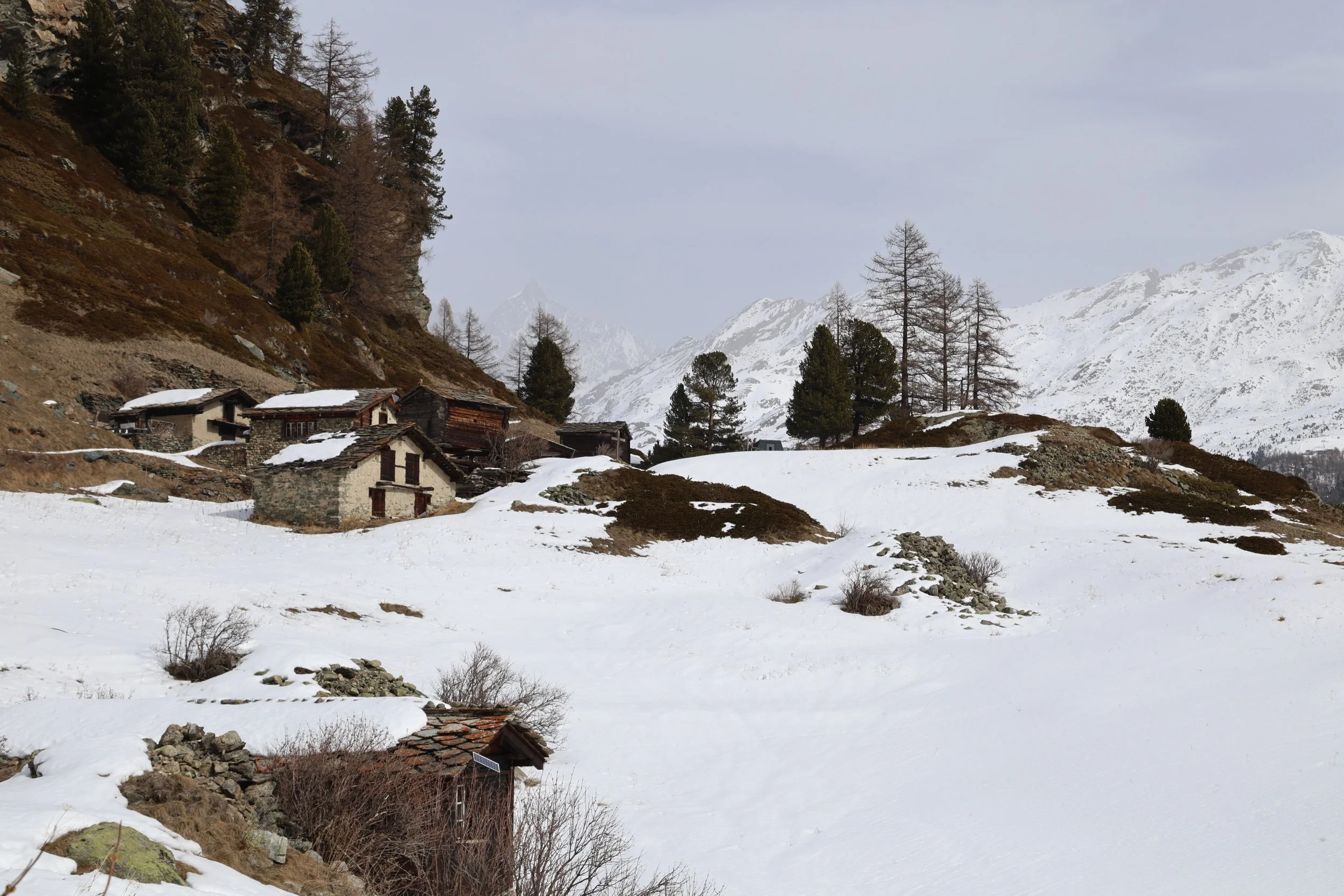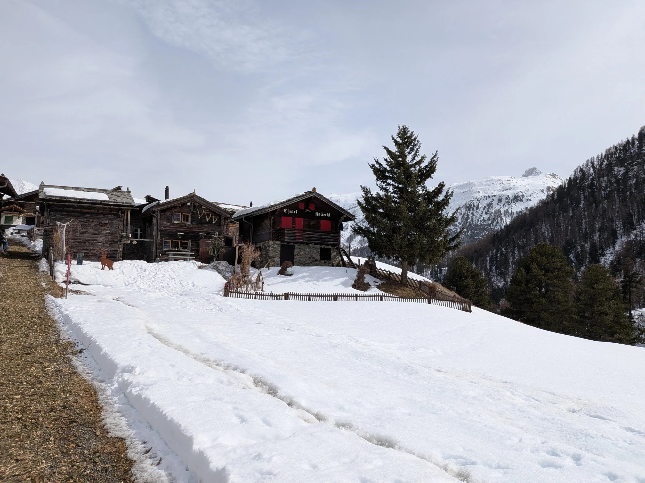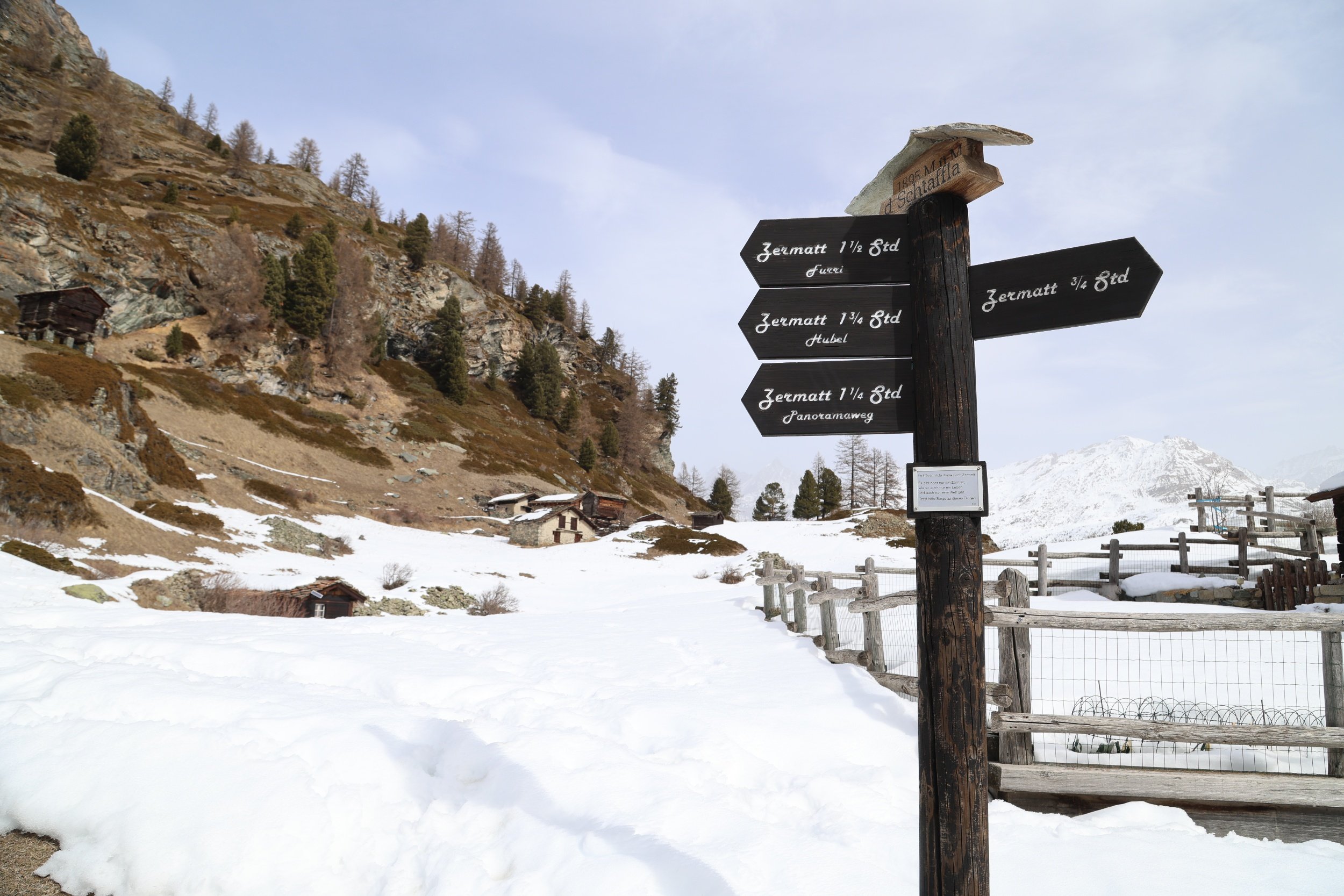 Zmutt wygląda na wioskę która otwiera się tylko na lato i która oferuje szlaki w pobliskie góry. W zimie wygląda, że część ludzi tak jak ja wybiera tą trasą, żeby na około dojść do Furi. Zdziwiłam się jednak, jak spotkałam parę która stwierdziła, że szuka tu restauracji, bo od lat tu przychodzą i fajna knajpka jest. Nie wnikałam czy w lato czy zimę tu przychodzą ale restuaracji tu nie widać a nawet gorzej, widać tylko jakiś spalony budynek.