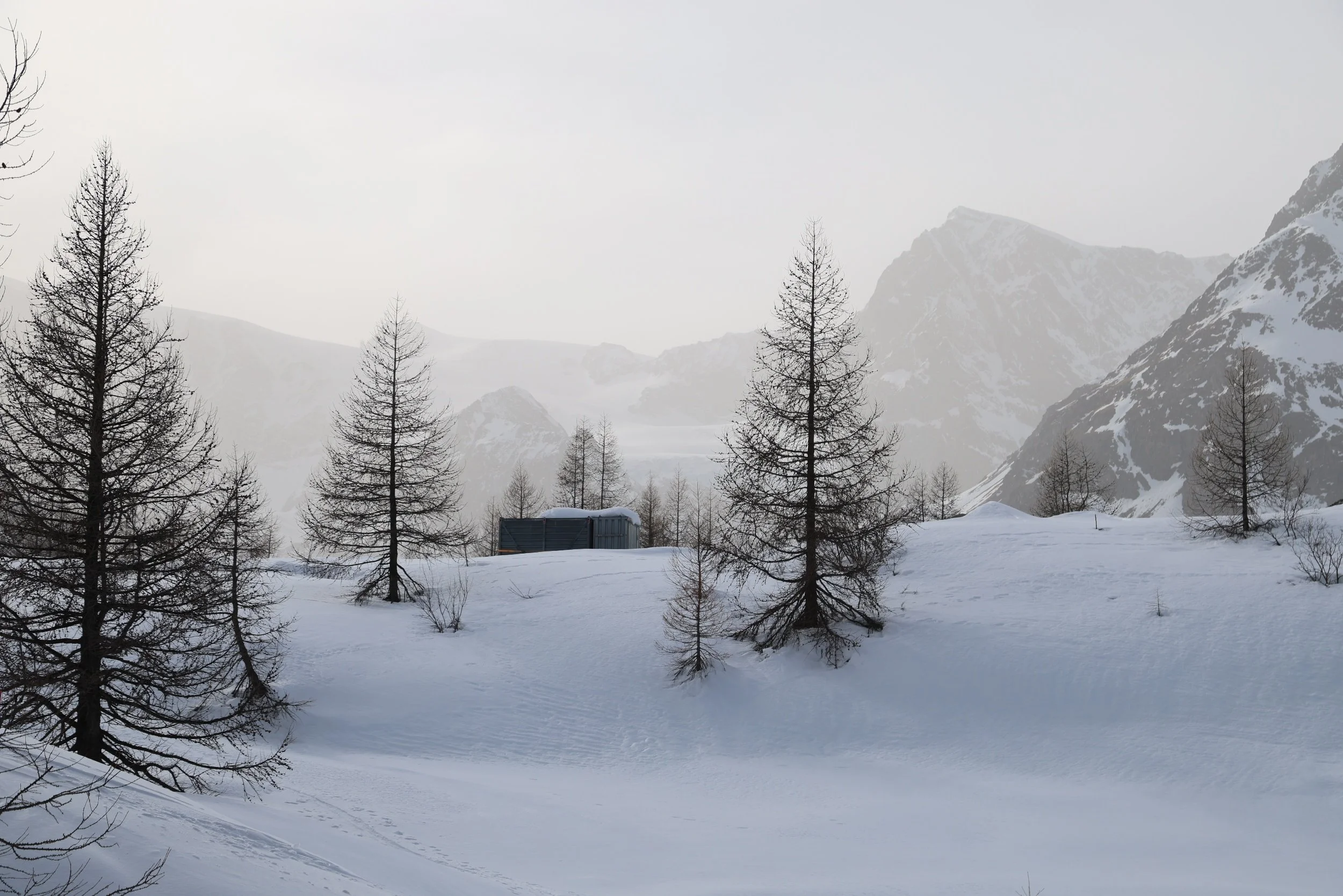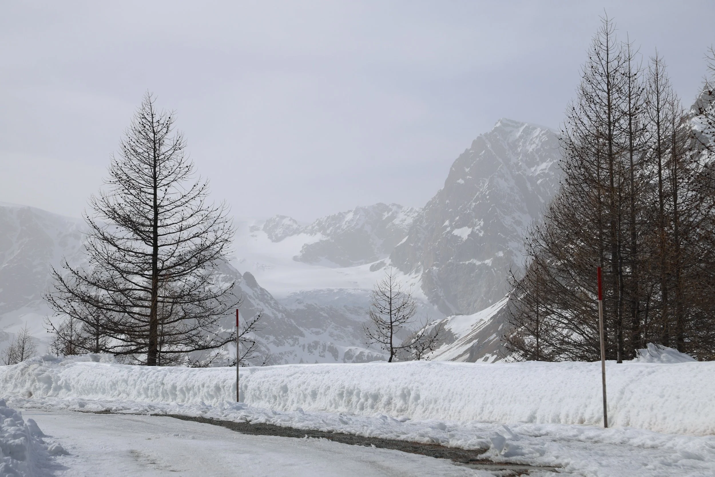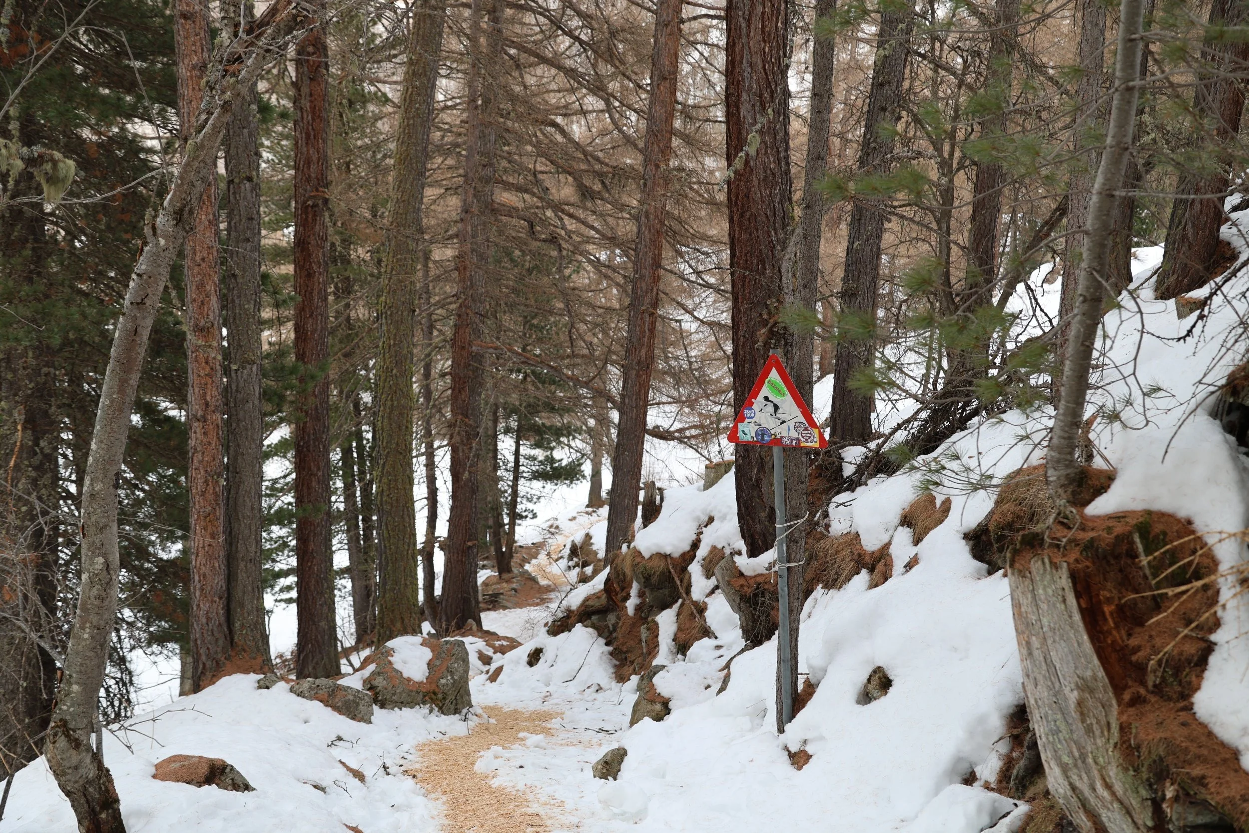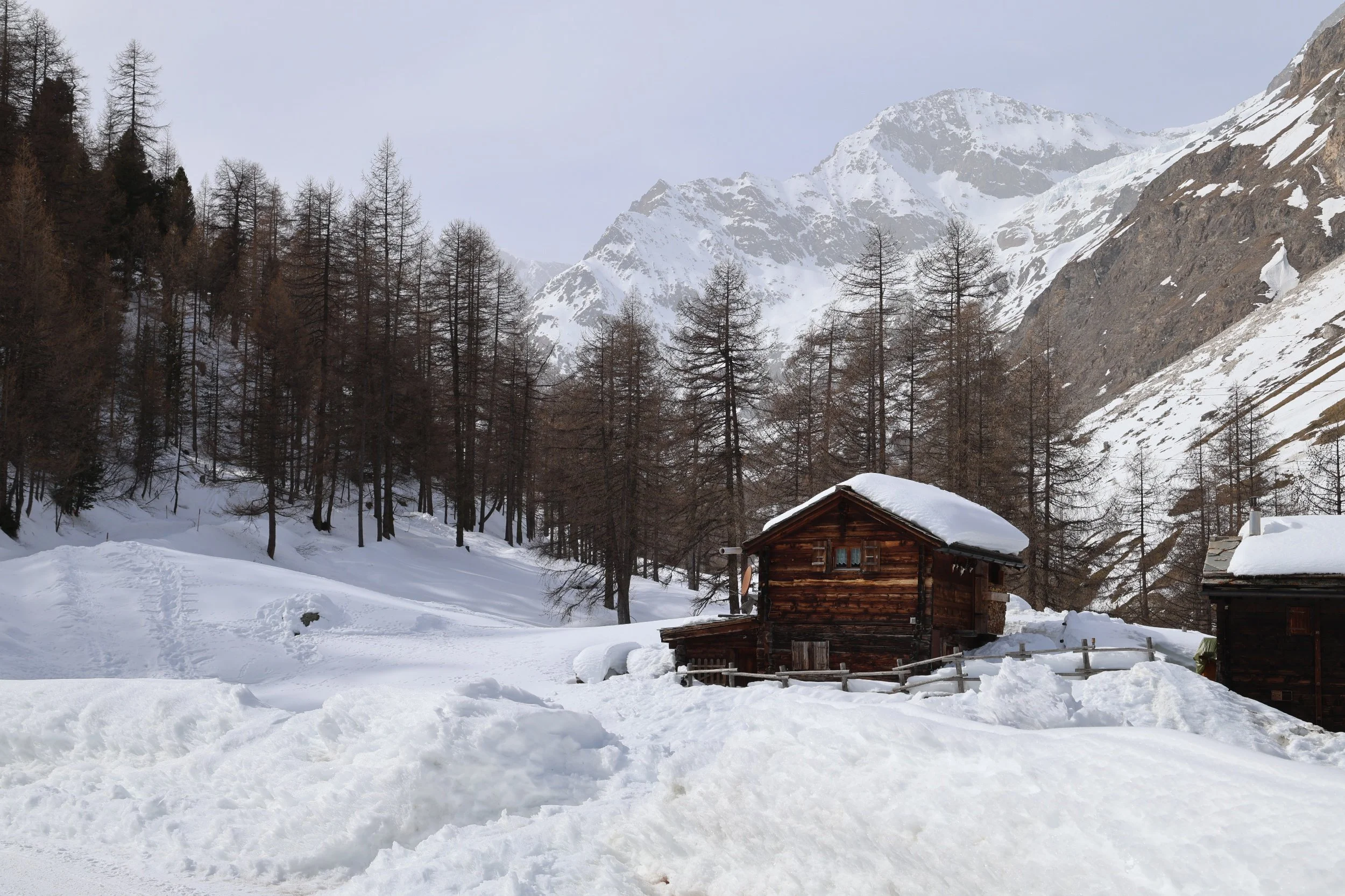 Zmutt wygląda na wioskę która otwiera się tylko na lato i która oferuje szlaki w pobliskie góry. W zimie wygląda, że część ludzi tak jak ja wybiera tą trasą, żeby na około dojść do Furi. Zdziwiłam się jednak, jak spotkałam parę która stwierdziła, że szuka tu restauracji, bo od lat tu przychodzą i fajna knajpka jest. Nie wnikałam czy w lato czy zimę tu przychodzą ale restuaracji tu nie widać a nawet gorzej, widać tylko jakiś spalony budynek.