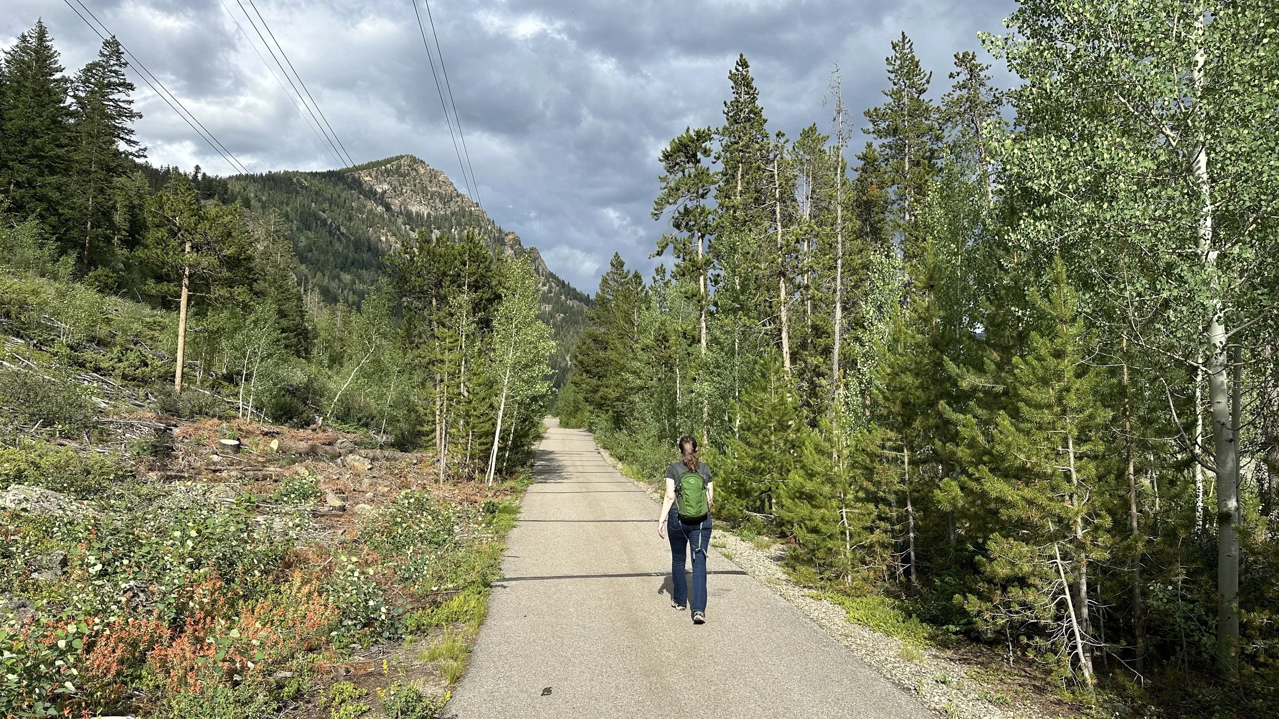 Prawie nie spotkaliśmy ludzi na dolnej części szlaku. Jeden rowerzysta nas prześcignął (szacun!) I trochę pojedynczych ludzi z pieskami czy biegaczy było na dole. Ale ogólnie trasa była nasza. Tak więc miarowym tempem doszliśmy do Overlook, czyli górnej bazy narciarskiej. Normalnie w sezonie można tam odpocząć i coś zjeść ale teraz oczywiście było zamknięte. Na szczęście stolik na zewnątrz były więc mogliśmy uzupełnić kalorie i trochę odpocząć. W tym miejscu opuszcza się resort narciarski i idzie się bardziej szlakiem … choć powinnam powiedzieć drogą.