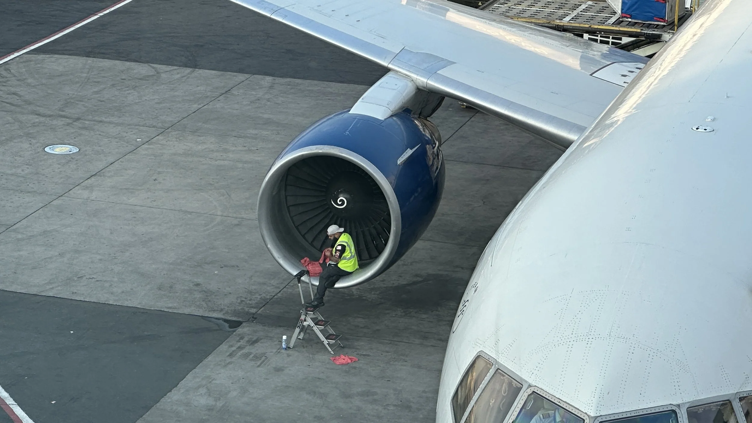 Przed startem kapitan wyszedł z kabiny pilotów i powiedział, że bardzo wieje. Da się lecieć, ale będą wielkie turbulencje. Nikt nie będzie mógł wstać (wliczając załogę) aż wylecimy odpowiednio wysoko.